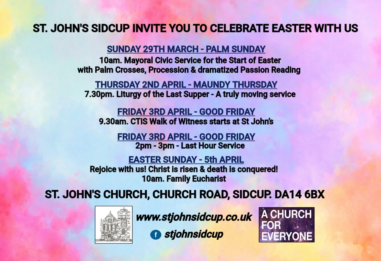 We would be very pleased to see you at any of our services or events – we have lots going on – please click on ‘What’s On’ above – and if you would like to keep up to date you could also follow us on Facebook @stjohnssidcup and Youtube.